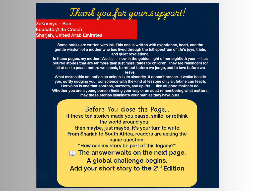 Some legacies are written in history books. Others are written in hearts. At 80 years old, my mother, Wasila, created a collection of 10 short stories — stories that carry timeless lessons of faith, kindness, and the beauty of human values. These stories are more than words on a page… they are a call to reconnect with heritage and pass wisdom from one generation to the next.